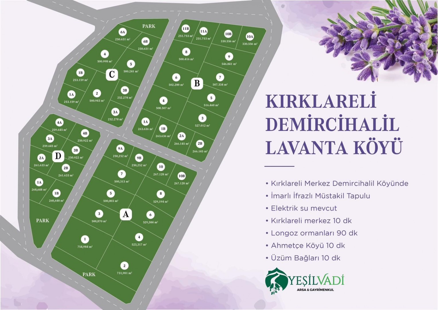 Kırklareli Merkez Demircihalil’de konumlanan Lavantaköy Arsa Projesi, lavanta tarlalarıyla ünlenen doğası ve temiz havasıyla hem yaşam hem yatırım için özel bir fırsat sunuyor. Ormanlarla çevrili bu eşsiz bölgede yer alan arsalar, tamamı inşaata hazır, imarlı, ifrazlı, müstakil tapulu ve elektrik-su altyapısı hazır şekilde yatırımcılara sunulmaktadır. Bölgenin doğal yapısı, manzarası ve Kırklareli merkeze yakın konumu sayesinde hem huzurlu bir yaşam hem de güçlü bir yatırım potansiyeli sağlar. Yeşil Vadi Arsa & Gayrimenkul güvencesiyle doğanın kalbinde değer kazanan bir geleceğe adım atın. 🌿🏡