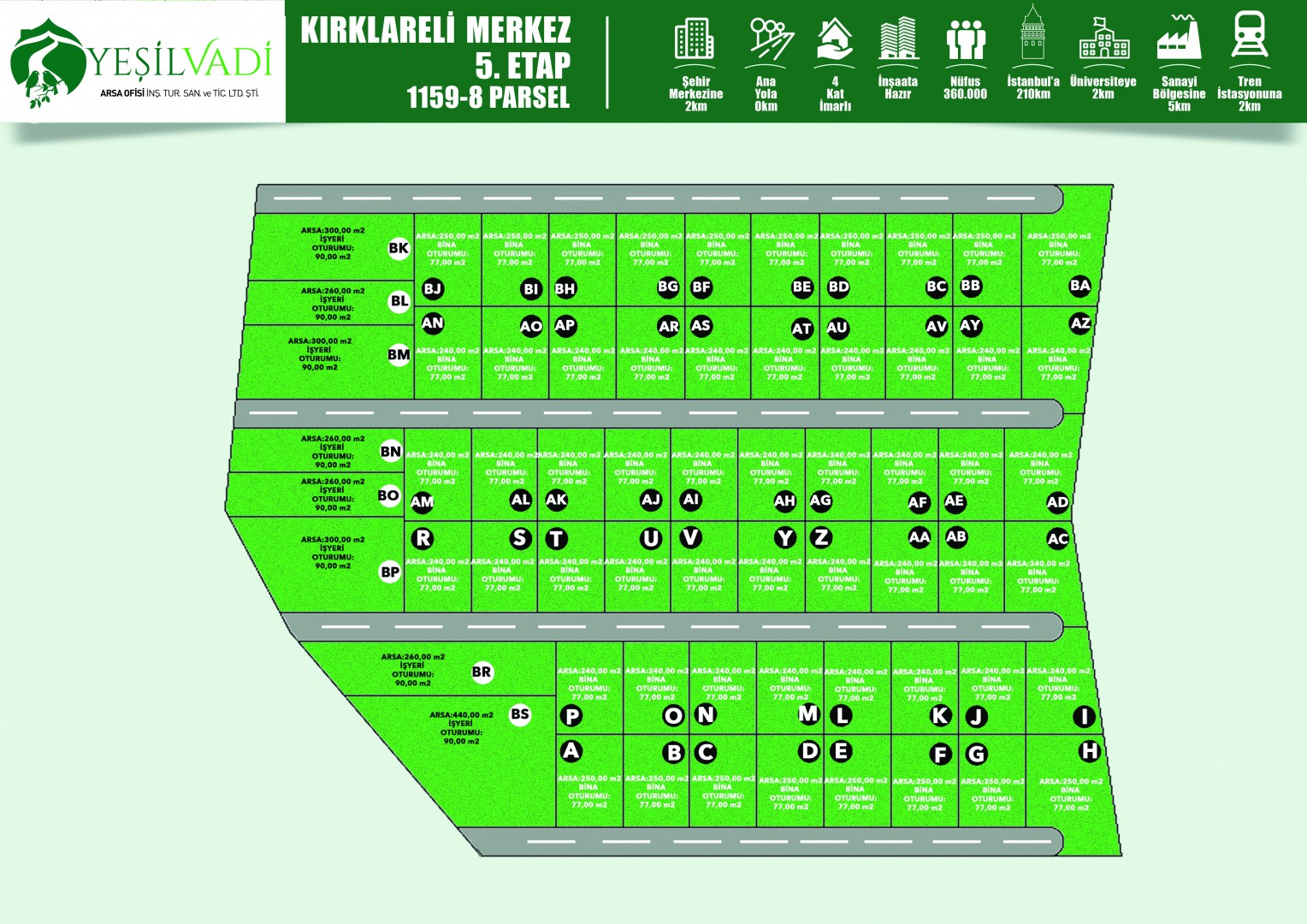 Kırklareli Merkez Camiikebir Mahallesi’nde konumlanan Merkez 5. Etap Projesi, prestijli bir yaşam ve güçlü bir yatırım fırsatı sunuyor. Toplam 64 bağımsız bloktan oluşan bu özel projede, arsalar projeli ve ruhsatlı olarak sunulmaktadır. 240 m² – 300 m² arası parseller, üniversiteye, hastaneye ve şehir merkezine yakın konumuyla yüksek değer potansiyeline sahiptir. Yeşil Vadi Arsa & Gayrimenkul güvencesiyle Kırklareli’nin gelişen merkezinde yerinizi şimdi alın. 🌿🏙️